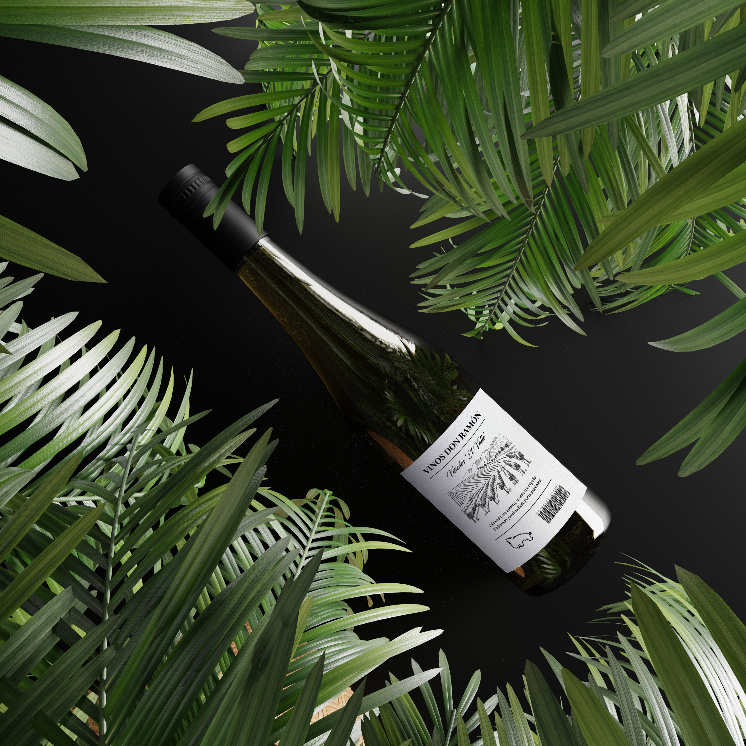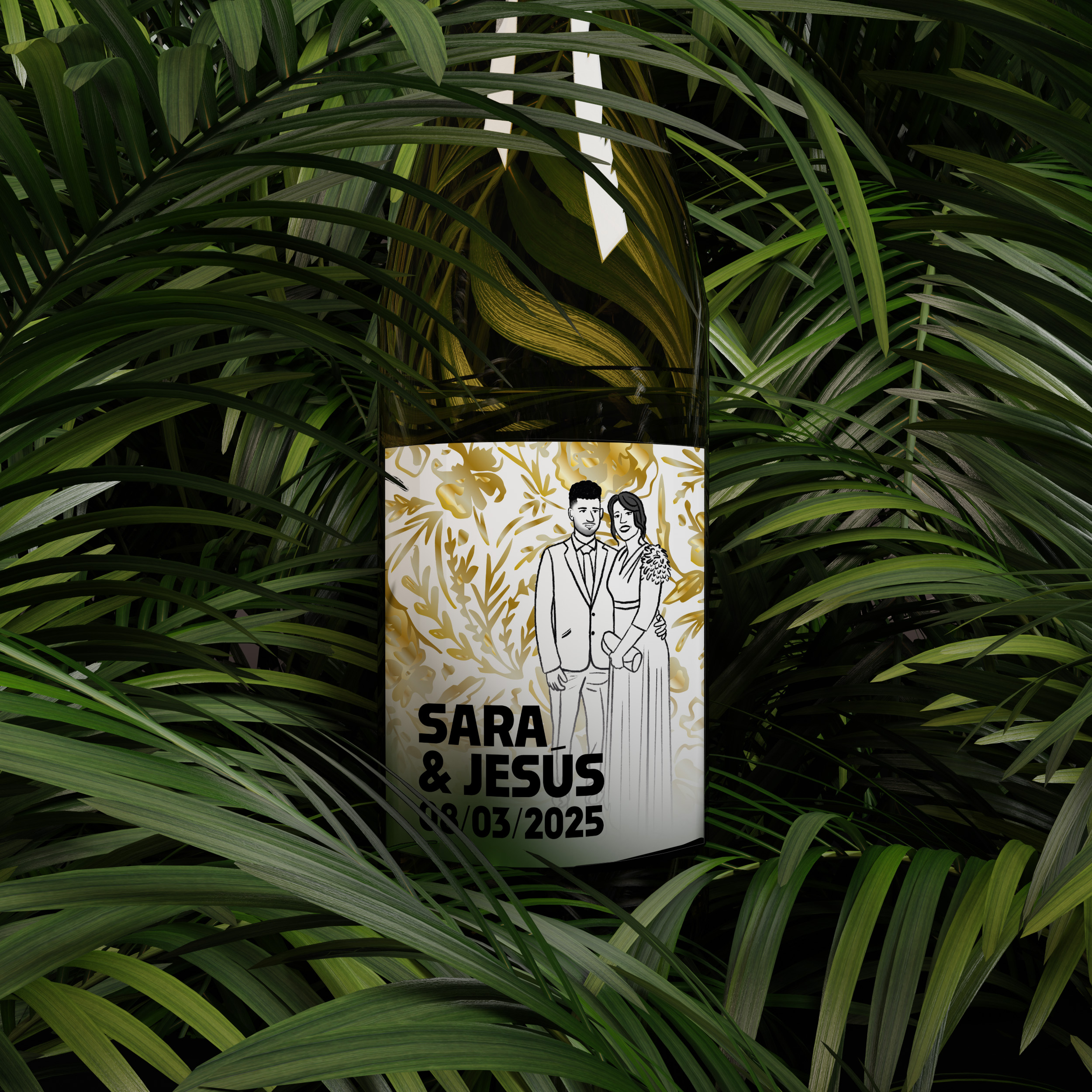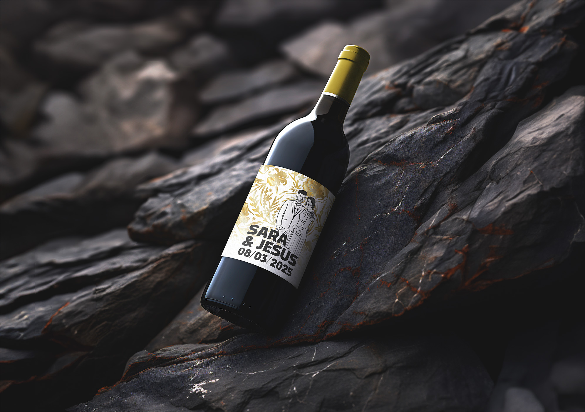 Diseño de etiqueta de vino estilo moderno con toques dorados.